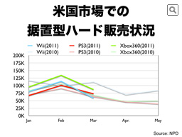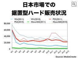 前年の年明けは、『New スーパーマリオブラザーズ Wii』発売直後の熱が維持された状態で、年明け以降も順調にWiiハードが売れていました。昨年末には、「集まればWii」のプロモーションで勢いを取り戻していたWiiのハードでしたが、今年の年明け以降は、高いレベルで売れ続けるタイトルを生み出せなかったことや、任天堂がニンテンドー3DSの発売に集中する選択をしたことで、年明けからの自社の新作ソフトが1本のみになり、現在の販売状況は低調と言わざるを得ません。ソニーさんのPS3が、ほぼ前年並みの実績を残されているのと比較しても大変対照的な状況にあります。