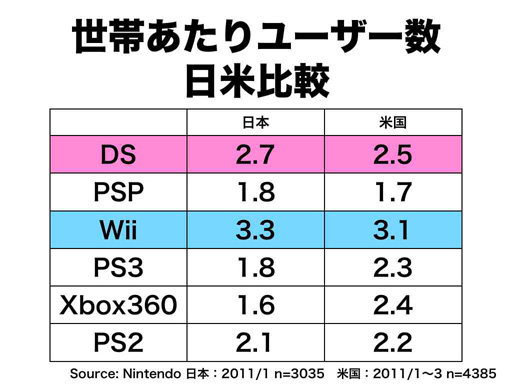 岩田: (スライドを示して)これは時々この場でお示ししている一覧表ですが、われわれがゲーム人口調査の中で毎回必ず重要な指標としている「世帯当たり、そのゲーム機のお客様は何人いるか」という平均値です。繰り返し申し上げてきましたが、この値が3を超えるというのは非常に特異なことです。といいますのは、これは1人住まいの方も含めた平均なので、大抵の家で家族全員が参加しているという状況が作れませんと、3を超えることというのはまず起きないんです。その意味で、多くの家族が「Wiiは自分に関係のないものではない」という状況を作ることができたという意味では、Wiiはコンセプトどおりの結果が出ていると思います。 |