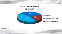 2つ目の表はその伸びの状況を表しています。アメリカ市場において、ゲームをプレイする方の43%は、任天堂のゲーム機でのみ遊んでいると答えています。これは、すべての据置型・携帯型ゲーム専用機を合わせたものです。そして、ゲームをプレイする方の30%が、任天堂と他社ゲーム機両方で遊んでいると答えています。他方、ゲームをプレイする方のわずか23%が、ソニー社もしくはマイクロソフト社のゲーム機だけで遊んでいると答えています。言い換えますと、全ゲームプレイヤーの内、4分の3以上の方が任天堂のゲーム機で遊ばれているのです。
