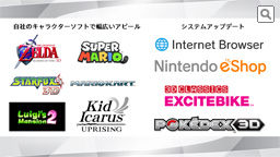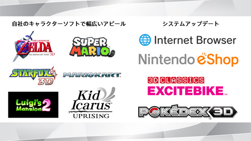 そして、今週、3DSに直接影響がある最初の全システムアップグレードが開始されました。インターネットブラウザーやニンテンドーeショップを介したデジタルダウンロードへのアクセス、3Dクラシックス(ファミコンのゲームを完全に3D化して再生したタイトル)である『エキサイトバイク』の無料ダウンロード、ファンの方が完全な3Dでお好みのポケモンキャラクターを探したり、分類したり、見たりすることができる『ポケモン立体図鑑BW』を提供いたします。