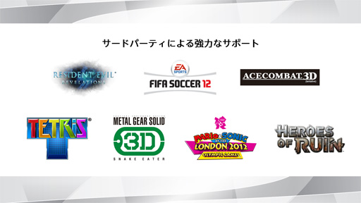昨日、幅広い層にアピールする5つの主要な自社タイトルの詳細を発表しました。各ゲームには、ユニークな魅力があり、そのうちのいくつかについて話をいたします。『マリオカート』は、8人のプレイヤーがワイヤレスでプレイすることができ、『新・光神話 パルテナの鏡』はARカードを使って対戦することができます。どちらも完全な3Dです。これらのゲームは他のゲーム機では決して見つけることができないものです。