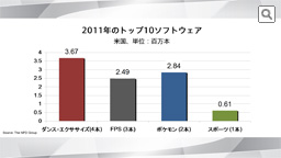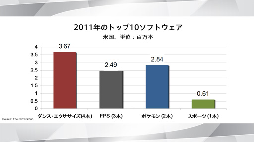 例えば、ダンス・エクササイズ系のゲームがトップ10に4本入っており、ファーストパーソンシューティング系のソフトが3本、そして、『ポケットモンスターブラック・ホワイト』が一つのカテゴリを構成しており、そして残りはスポーツ系です。