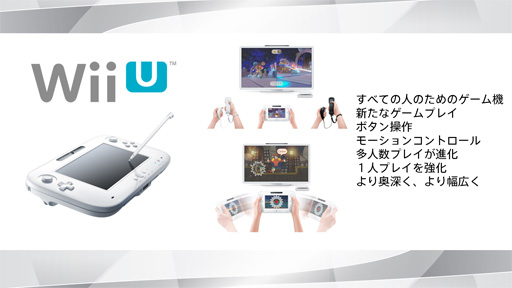 それでは、新しいWii Uのゲーム機がどのように機能するかを明確にしましょう。ゲーム機はインターネットに接続した際に強固なオンライン環境を持っています。ゲーム機は2つのスクリーンに情報を送り、新しいコントローラは至近距離にあるものを見る(one-foot experiences)ために最適化され、その一方のTVは鮮やかなHD映像を映し出します。