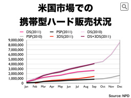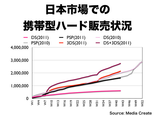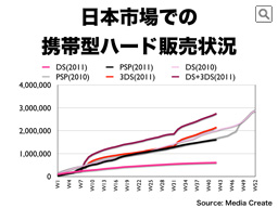 年間を通じた累計販売数の推移で見ますと、DSの販売は大きく落ち込んでいますが、3DSは、値下げ以降販売ペースを加速させており、DSと3DSの合計で任天堂の携帯型ハード全体で見ますと、昨年を大きく上回るペースで推移していることがわかります。