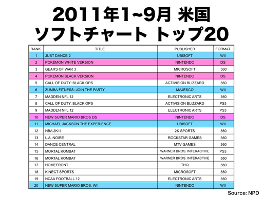 これは、アメリカの今年1月から9月までの、ソフト販売上位20位までのヒットチャートです。