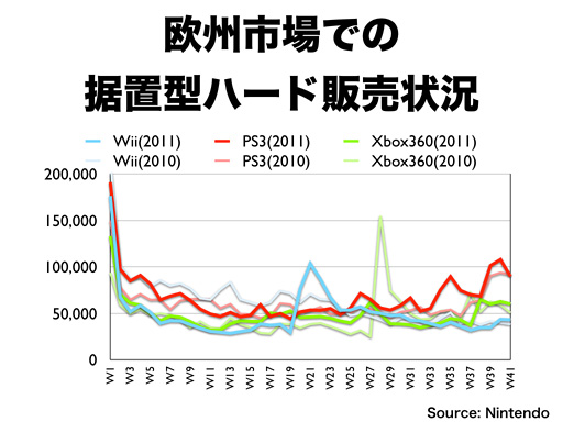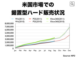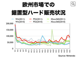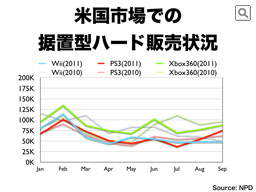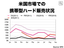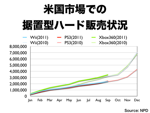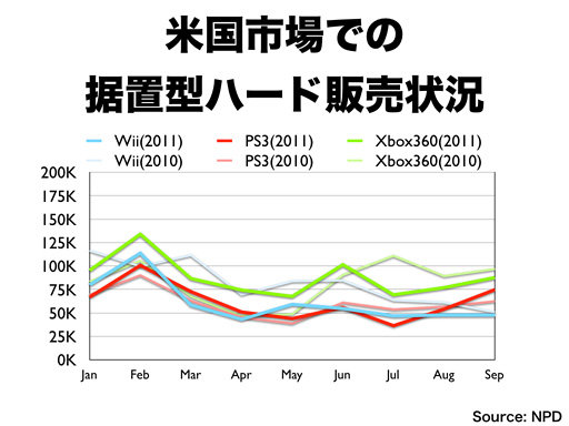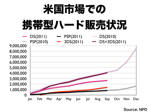 ニンテンドーDSは3月にニンテンドー3DSが発売されることもあって、前年に対して減っていますが、日本と比較すると、新しいプラットフォームへの移行がゆっくり進む市場特性もあって、一定の市場規模を維持しています。
