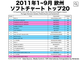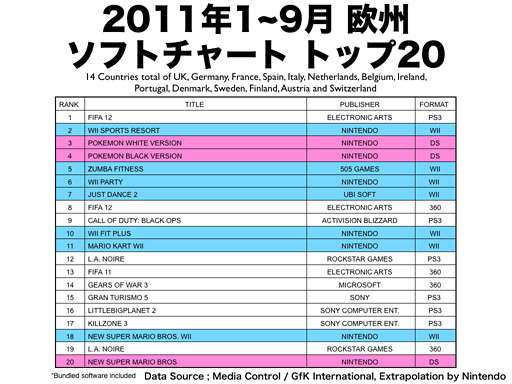 これは、ヨーロッパの14カ国、具体的には、イギリス、ドイツ、フランス、スペイン、イタリア、オランダ、ベルギー、アイルランド、ポルトガル、デンマーク、スウェーデン、フィンランド、オーストリア、スイスの今年1月から9月までの、調査会社さんが調べているソフト販売数を任天堂で集計し、上位20位までのヒットチャートにしたものです。