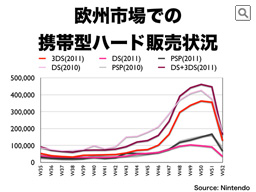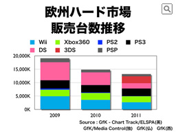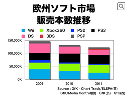 昨年のヨーロッパのハードでは、1年で同じくらいの規模売れたハードが、ニンテンドー3DS、PS3、Xbox360、Wiiと存在し、どれもが絶対的なマーケットリーダーになれない結果でした。