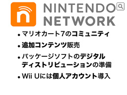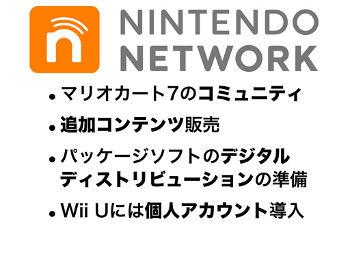 また、Wii Uにおいては、ニンテンドーネットワークに対応した個人アカウントシステムを導入する予定です。これにより、従来課題となっていた、1台のハードを複数の家族が共有する上での使い勝手が向上するほか、さまざまなサービスやコンテンツを連携できるシステムを実現し、ご提案できると考えています。 今後、自社他社問わず、多くのソフトで、インターネットを活かしたサービスを、ニンテンドーネットワークの名称でお楽しみいただけるよう、積極的な対応を進めていきます。
