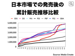途中までは、普及ペースが順調とは言えなかった赤色のニンテンドー3DSが、値下げをきっかけに販売を伸ばし、特に、『スーパーマリオ 3Dランド』・『マリオカート7』・『モンスターハンター3(トライ)G』等の有力タイトルが揃った年末には、期待通りの爆発的な販売状況となりました。年末にはDSやWiiより早く400万台を突破したというニュースが流れたのを、覚えておられる方も多いと思います。しかし、この普及ペースは、年末の時点では日本のゲーム史上最速ではなく、ゲームボーイアドバンスの普及ペースを下回っていました。しかし、年明け以降もニンテンドー3DSの販売の勢いは持続しており、2週間前に史上最速の普及ペースの記録を新たに塗り替えました。