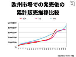 こちらは、ヨーロッパのデータです。ヨーロッパでは、ニンテンドーDSの発売1年目にも、『nintendogs』のヒットにより、アメリカより良いペースで推移していましたが、2つのマリオタイトルが揃ってからのニンテンドー3DSは、これを上回るペースで加速し、12月には、ヨーロッパ全体のハード販売台数では、ニンテンドー3DSがトップシェアになり、大きく販売を伸ばしました。