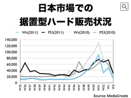 年末商戦期にWiiの販売も伸びましたが、ファミリー層のアテンションがニンテンドー3DSに集中したことが影響し、前年と比較して年末商戦の盛り上がりが遅く、そのピークも小さく推移してしまいました。ソニーさんのPS3は、前年並みの実績を残されましたが、昨年末には1週間に10万台以上販売できた据置型ハードはなく、市場において大きな存在感を示すことはできませんでした。