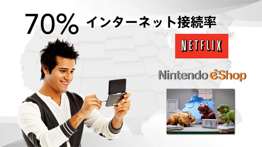 米国では、ニンテンドー3DSハードの累計販売台数に対してインターネット接続を経験したハードの台数が70%に達しています。これは、私たちにとって重要な数値であり、これまでの任天堂の携帯型ゲーム機の中で最も高いものになります。インターネット接続率の向上は、任天堂やコンテンツパートナーが、『ニンテンドーeショップ 』や『ニンテンドービデオ』のような新たな体験やサービスをお客様にご提供することを可能にしていきます。事実、ニンテンドー3DSをお持ちで、『ニンテンドーeショップ』でコンテンツをお買い求めいただいているお客様は、平均して5つ程度のコンテンツをご購入されています。これは、無料アプリや無料ゲームではなく、5つの有料ダウンロードコンテンツという意味です。