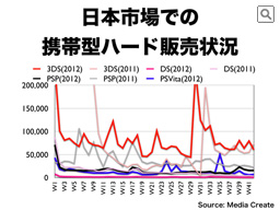 これは、メディアクリエイトさんのデータに基づく、日本市場の携帯型ハードの販売状況を示すグラフです。