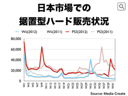 Wiiは、年明け以降、昨年に準じる流れで推移しましたが、8月上旬に『ドラゴンクエストX』の発売時に大きく販売を伸ばしました。しかし、直近では年末に新機種のWii Uが発売されることも影響し、販売は減速傾向にあります。