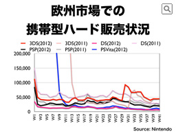 ニンテンドー3DS XLの発売前は、トップシェアではあるものの、決して好調とは言えなかったニンテンドー3DSですが、7月末のニンテンドー3DS XLの発売、このグラフの第30週のところから大きく販売を伸ばし、昨年夏の値下げ時を超えるインパクトとなり、8月にはヨーロッパのゲーム市場を3DSが牽引する状況となりました。年間で最も携帯型ゲーム機の販売が下がる9月から10月前半の時期にも、販売ペースを一定レベルで維持できましたので、ニンテンドー3DSがこれから年末に向けて販売を大きく伸ばすための足場を固めることができたと感じています。