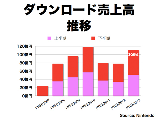 岩田: こちらはダウンロード売上高の推移です。今期はまだ第3四半期までしか終わっていませんが、第3四半期の時点で111億円となっており、間違いなく今期は過去最高になると思います。この真ん中にある比較的バーが高い時期というのは、Wiiがかなり普及していて、ニンテンドーDSiが出始めた頃でしたので、当時のWiiの普及台数よりもかなり少ない今のニンテンドー3DS中心のダウンロードビジネスがかなり大きくなったということは、一定の手応えが出てきたと思っています。単純にパッケージ版をダウンロード版に置き換えようとは思っておりませんが、現状のパッケージ版の流通にはいろいろな課題もあり、私たちのつくるゲームソフトは発売前に何本売れるかを完全に予測することは誰にもできません。誰もが「ヒットさせたい」と思ってつくり、売り出します。それがどれだけ売れるかは、どんなにご経験の長いバイヤーさんにも分からないことで、時には過剰在庫になって値崩れが起き、時には品薄になって買えなくなってしまうということが起きるわけです。そういう課題があり、そういうリスクがどんどん大きくなり、小売店さんもなかなか在庫リスクをとれないという流れの中で、「せっかく良いソフトをつくってもチャンスロスがあった」、あるいは、「お客様からかなりご評価いただけたのに、つくり過ぎたために値崩れが起きてブランドが壊れてしまう」というようなことが繰り返し起きておりました。このダウンロード版の販売について、POSAカードの取り組みを通じて店頭に広げることを私が波多野に話した際、波多野が最も強く言っていたのは、「これは現行の流通さんが抱える問題を大きく解決するチャンスがある」ということでした。今回『とびだせ どうぶつの森』のダウンロード版を、いわゆるPOSAカードという形での、店頭でPOSレジを通ったときに初めてアクティベーションされる、小売店さんからすると在庫リスクのない形で並べていただき、かなりの数量を販売することができました。こういう事例ができたことにどんな意味があったかといいますと、「こういう形でも、ゲームソフトが売れる事例がある」ということを小売店の方々にご理解いただけたことにあると思っています。ですから、今後は、例えば「デジタル専売の商品でも、POSAカードで売るというようなことが可能になるのではないか」とか、あるいは「POSAカードへの展開をするタイトルを増やしていただけるのではないか」と思います。さすがに、コンビニエンスストアさんの店頭というのは棚の(陳列)面積に制限がありますのでそれほど増やせないと思いますが、「もう少し大きな規模の小売店さんの場合は、そういう売り場を拡充していただけるのではないか」、あるいは、「そういうことをよくご存知ない方のためにいろいろ店頭でアシストしていただけるような小売店さんが出てくるのではないか」など、いろいろな可能性があると思っています。その意味において、これからデジタル販売というものの重要性はますます高まると思いますし、これから有望な分野だと思っています。 次に中国についてですが、確かに先日報道がございましたが、私たちの認識では、いま状況が大きく変わったという認識はしておりません。もちろん、状況が大きく変われば私たちにはチャンスがあります。そういうことがあった場合に動けるような準備はしておりますが、現状で状況が大きく変わったという認識をしておらず、そういう情報の確証がございません。情報に確証があれば正式にどうするのかということを現地からお知らせするようにしていきたいと思っています。状況が変われば、私たちにはできるオプションが増えるとご理解ください。 |