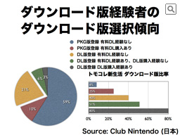 まず、『とびだせ どうぶつの森』を、パッケージ版を購入されて登録された方、ダウンロード版、これには、本体同梱パックを購入された方を含みますが、ダウンロード版を購入されて登録された方のうち、これまでの有料ダウンロードの経験の有無で、5つのグループに分類しました。クラブニンテンドーは、ゲーム関与度の高いお客様が多いので、ダウンロード版の割合が、実際の市場全体に比べてより高い傾向があり、登録されているお客様全体の3割強がダウンロード版を登録されています。