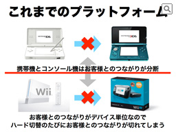 ここにお示ししているのは、過去10年間に登場した任天堂のプラットフォームですが、まず、携帯機とコンソール機は、ソフトを通じた連携などにはチャレンジしてきたものの、基本的に、携帯機とコンソール機とは、任天堂とお客様のつながりが完全に分断している状態になっていました。
