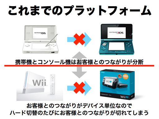 また、携帯機どうし、コンソール機どうしの関係でいえば、ソフト資産を引き継ぐために前のハードのソフトをそのまま使っていただくことができる互換性によって、ハードの乗り換えを促進するようなことには取り組んできましたが、任天堂とお客様とのつながりがデバイス単位であるために、ハード切り替えのたびに、お客様とのつながりが切れてしまうという課題がありました。