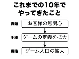 お客様の「ビデオゲームに対する無関心」という課題に対応するために、「ゲームの定義を拡大」するという手段を採ることで、「ゲーム人口の拡大」を実現するという戦略は、ニンテンドーDSやWiiで成果をあげることができたと自負しています。