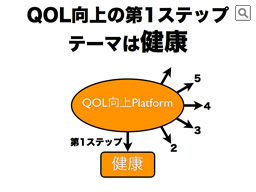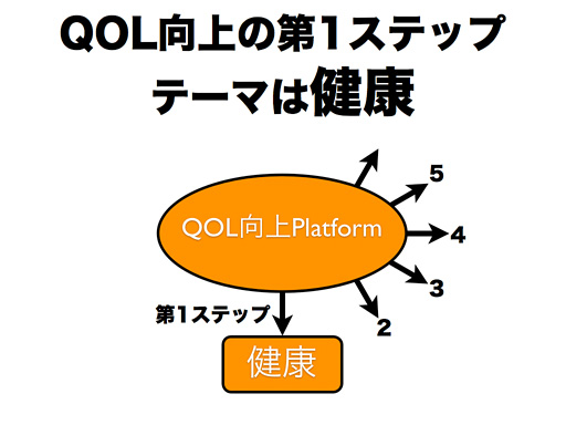 「健康」というテーマです。もちろん、QOL向上プラットフォームという新たな娯楽事業の定義をすると、「学習」や「生活」をはじめ、今後さまざまな可能性がありますが、まずは、最初のステップとして「健康」をテーマにする、ということです。