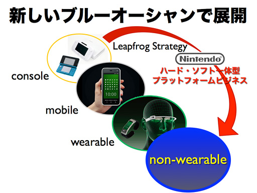 そこで、モバイルやウェアラブルではなく、ノン・ウェアラブル、すなわち「身につける必要がない」ということを特徴とする新たな領域で、ハード・ソフト一体型プラットフォームビジネスを実現したいと考えています。当社が健康というキーワードを使うと、どうしても『Wii Fit』を連想されると思いますが、テーマについてはこれまで当社のゲーム機では扱ったことのないものを考えていますし、その実現手段となるハードウェアを含めて、ブルーオーシャンを目指していきます。