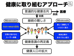 ただ、健康に良いことは、総じて、何らかの努力が必要である場合が多く、継続は簡単ではありません。多くのみなさんが経験されたことがあるのではないかと思いますが、健康に良いことは分かっていても三日坊主で終わってしまう、ということが起こるのが普通です。ここに任天堂の娯楽企業としての楽しく継続していただく能力、娯楽企業としてのおもてなし能力、そして今回の大きな特徴であるノン・ウェアラブルという構造と、日常に溶け込むユーザー体験によって、この継続の難しさを乗り越えていただけるようにします。これが乗り越えられれば、継続的に健康についてフィードバックができるようになり、健康意識が再定義され、最終的に健康人口の拡大を実現する、というのが、今回のアプローチになります。