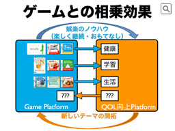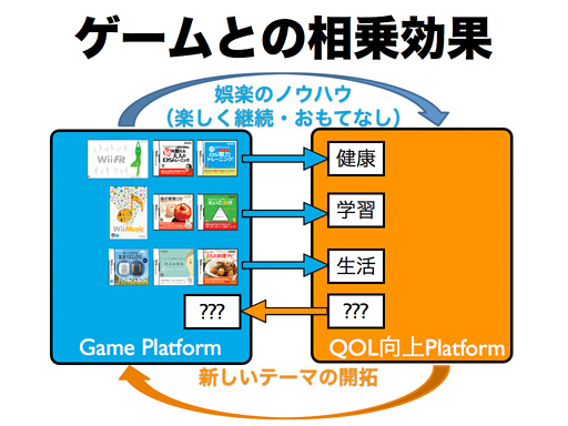 逆に、これはすぐにではなく、展開後2〜3年経ってからになると考えていますが、QOL向上プラットフォーム側から、新たなテーマが発掘され、それは、将来ビデオゲームプラットフォームで動作するソフトとして、新しいテーマの開拓に役に立つことも期待しています。一度このサイクルが回り出すと、両方のプラットフォームに好循環が生まれ、共によりユニークな展開が可能になります。