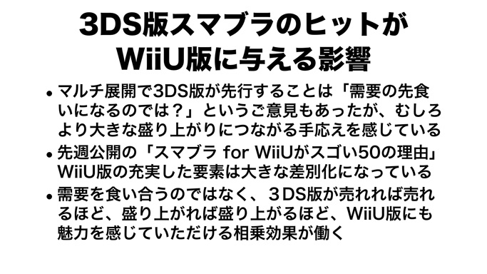 先ほどお話ししたように、ニンテンドー3DS版『スマブラ』が良いスタートを切りましたが、このことがWii U版にどのような影響があるのか、ということをお話ししておきたいと思います。