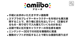 そして、Wii U版『スマブラ』と同時に展開される、新カテゴリー商品『amiibo』が登場します。amiiboは、NFCチップを搭載することで「ゲームとつながるフィギュア」であり、任天堂自身が手掛ける任天堂IPの活用事例でもありますが、単にそれに留まらず、この商品群によって、いくつかのことを同時に実現することを狙いとしています。