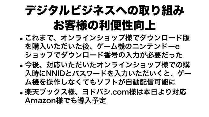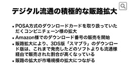 ビデオゲーム専用機の世界でも、ソフトウェアをデジタル流通で販売する割合が高まってきていますが、この間、任天堂が取り組んできたことを、この場でいくつかお話ししたいと思います。
