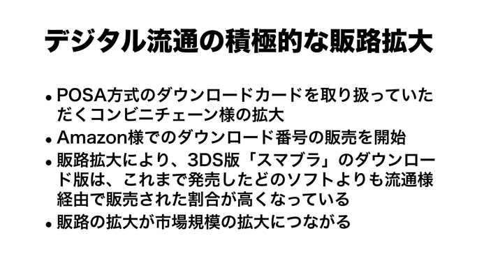 その結果、3DS版『スマブラ』のダウンロード版は、これまで発売したどのソフトよりも流通様経由で販売された割合が高くなっており、販路の拡大が市場規模の拡大につながる手ごたえを感じています。