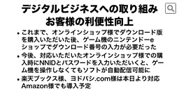 Newニンテンドー3DSでも、Suica決済が実現できるように検討を進めていますが、これが実現できますと、ニンテンドー3DSには500円以下のデジタルコンテンツが大変充実していますので、また、新たな可能性が開けるのではないかと期待しています。