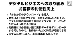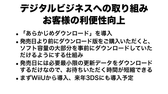 また、この年末に発売する『大乱闘スマッシュブラザーズ for Wii U』では、私たちが、「あらかじめダウンロード」と呼んでいる仕組みも導入します。