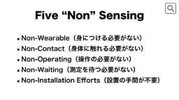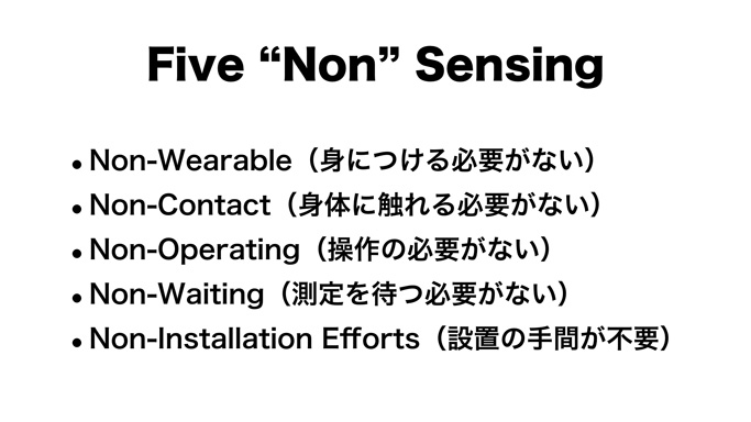 Five “Non” Sensingというのは、これまで計測に必要だった5つのことを不要にして、睡眠状態・疲労状態を自動計測するというコンセプトです。