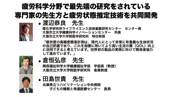 渡辺恭良(わたなべ やすよし)先生は、健康に関して幅広い分野に精通されている先生で、疲労科学において世界的に著名な方です。渡辺先生からは、「疲労度の高精度簡易計測は、現代人にとって非常に有意義な生体状況の自己把握であり、これを指標に用いてより高い生活の質(QOL)向上に活用できると考えています。世界初の製品の実現に向けて関係者協力して進めています。」とのコメントをいただいています。