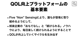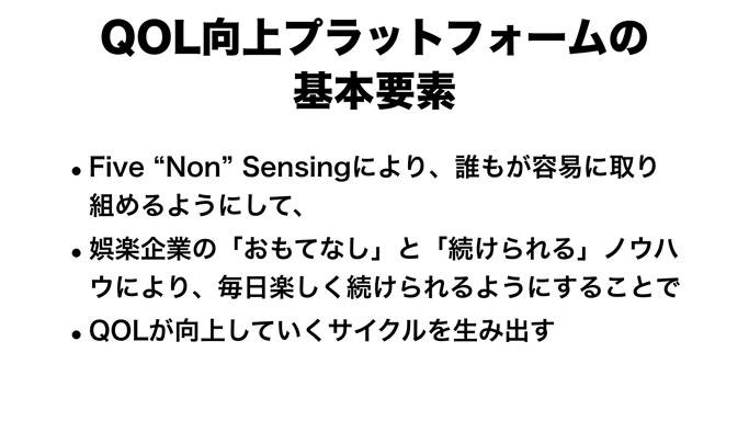 Five “Non” Sensingにより、誰もが容易に取り組めるようにして、娯楽企業の「おもてなし」と「続けられる」ノウハウにより、毎日楽しく続けられるようにすることで、結果的にQOLが向上していくサイクルを生み出す、というのが、QOL向上プラットフォームの基本要素、ということになります。