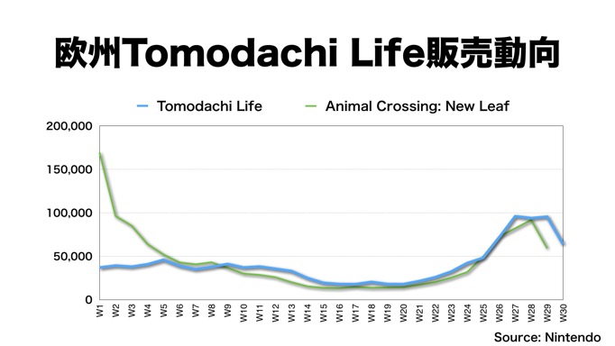 年末までのヨーロッパでのセルスルーは、デジタル版を含むと『Animal Crossing』が約128万本、『Tomodachi Life』が約122万本で、ほぼ同水準になりました。発売時の知名度が全く異なり、初動が大きく違ったことを考えると、これは、非常に良い結果だと思いますし、フランス1国のセルスルーが、アメリカでのセルスルーを上回っていることは、特筆すべきことだと思います。