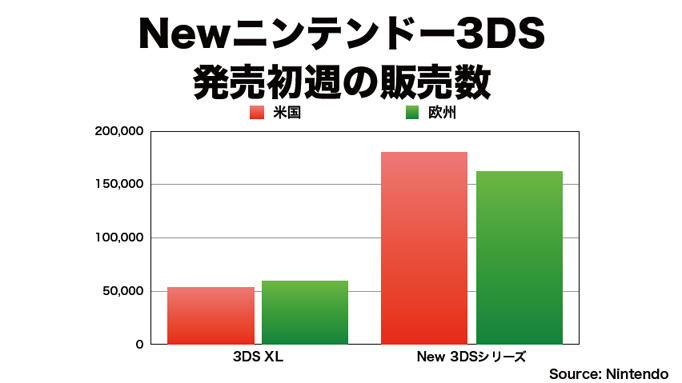 これは、現地時間の、先週金曜日に発売されたNewニンテンドー3DSシリーズの発売初週の販売数の自社調べ速報データです。アメリカでは発売から3日分、ヨーロッパでは日曜日が小売店さんがお休みのため発売2日分の販売数を、ニンテンドー3DS XLの発売と比較したものです。年末には、能動的にゲーム情報を集めておられるゲームファンのお客様は、ニンテンドー3DSハードの購入をNewニンテンドー3DSの発売までお待ちになっていたようですが、通常は商戦期ではないこの時期に、有力な同時発売ソフトとの相乗効果もあって、大変順調なスタートになりました。次の課題は、この勢いをいかに維持していくかということに移っています。