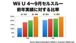 これは、10月の経営方針説明会でもお見せした、今上半期における日本・アメリカ・ヨーロッパのWii Uのハード・ソフトのセルスルーが、前年実績に対してどれだけの比率になっているのかをグラフにしたものに、オーストラリアのデータも加えたものです。