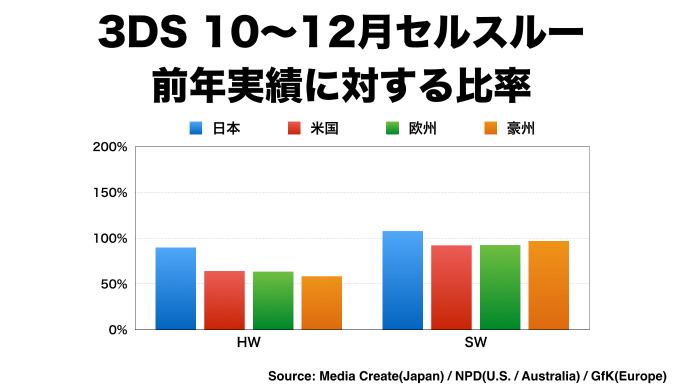 ご覧のように、Newニンテンドー3DSの販売が四半期を通じて寄与した日本を除き、Newニンテンドー3DSを未発売のアメリカ・ヨーロッパ、発売が11月後半だったオーストラリアでは、ハードの販売は、前年実績を大きく下回っていました。