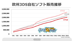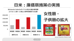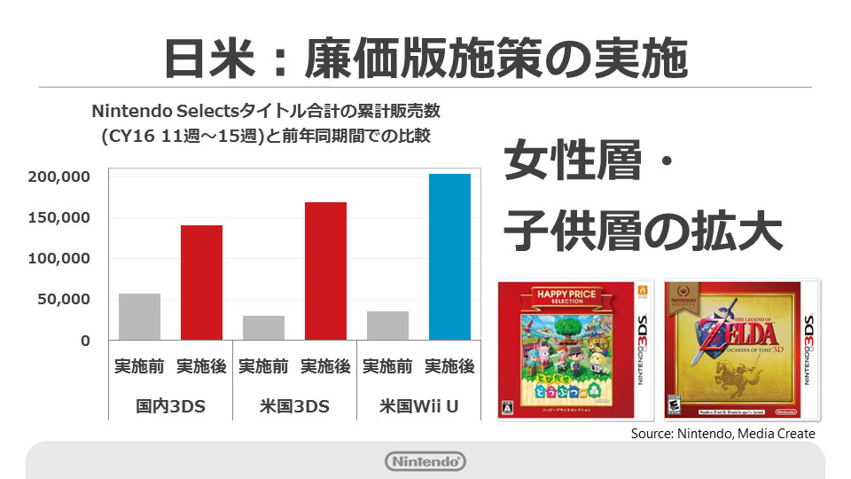 同様の施策は、国内やアメリカでも実施し、国内では「ハッピープライスセレクション」という名称で展開しています。前年同期間のセルスルーと比べると、販売本数が大きく伸びていることに加え、女性やお子様の比率が高まっており、お客様の層を広げられていると感じます。ソフト1本1本の価値を毀損することなく、適正な価格でお客様に認めていただくことを当社は大切に考えていますので、このような取り組みを必要以上に多用することはしませんが、数ある発売済みのラインアップの中から、新たな1本を発見し、お手に取っていただくためのきっかけになればと考えております。こうした取り組みにより、2016年以降のニンテンドー3DSプラットフォームで継続的に楽しんでいただく状況を維持していきたいと考えています。