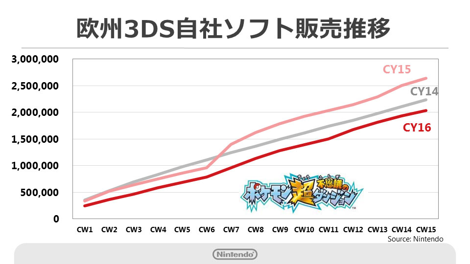 ヨーロッパ市場では、2月に発売した『ポケモン超不思議のダンジョン』や、昨年10月から実施している「Nintendo Selects」が引き続き堅調に推移していますが、自社ソフト全体の販売規模としては、2014年を少し下回る推移です。ただいまご紹介した『ファイアーエムブレムif』は、欧州では5月に発売を控えております。