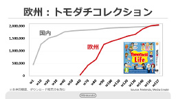 ヨーロッパ特有の話題として、『トモダチコレクション』は国内でも直近で200万本のセルスルーに到達した大型タイトルですが、ヨーロッパ市場では、『Tomodachi Life』という名称でヨーロッパ地域の各言語にローカライズし、2014年6月に発売いたしました。以降、非常に息の長い売れ方をしており、約2年をかけて、国内との差を徐々に詰め、国内の販売本数を抜きました。こうした、業界内で他に競合するソフトが少なく、女性のお客様にもアピールできるソフトのポテンシャルを引き出すことで、当社商品をより幅広いお客様に楽しんでいただけると考えています。