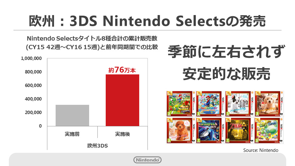 また、前回の決算説明会で、昨年10月にヨーロッパで投入した廉価版タイトル「Nintendo Selects」が好調に推移しているとお伝えしましたが、季節による販売動向への影響が少なく、年明け以降も、順調に販売本数を増やしています。グラフの赤色で表しているのが、「Nintendo Selects」として投入したニンテンドー3DSソフト8種類合計のセルスルーで、同じタイトルの前年同期間での合計セルスルーを灰色で示し、比較をしています。