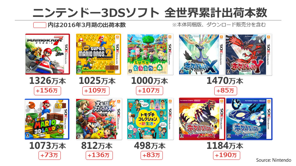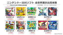 こちらは、ニンテンドー3DSの主要タイトルとその全世界ベースでの累計出荷本数をまとめたものですが、赤枠内に16年3月期単年度での出荷本数を記載しております。発売から時間が経過したタイトルでも、この1年間で100万本前後の上乗せをしているように、ニンテンドー3DSの豊富な定番タイトルは多くのお客様に受け入れていただけるものであり、最近ハードをお買い求めになったお客様にもまだまだ楽しんでいただける十分なラインアップがあると考えています。