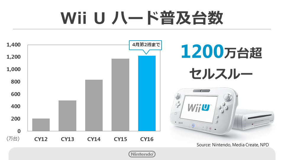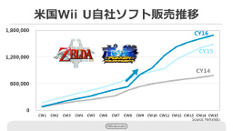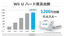 Wii Uは、ハードのセルスルーが全世界で1200万台を超えました。過去のホームコンソール機に比べると普及台数は及ばないものの、2015年は、『Splatoon(スプラトゥーン)』のヒットに恵まれたことなどが影響し、国内で販売台数を伸ばしました。