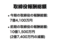 まず、当社取締役の報酬の算出方法についてお話させていただきます。第71期の取締役の報酬総額は、7億4,100万円でございました。その前の第70期の10億1,500万円から2億7,400万円の減額になりました。この減額の主な理由は、業績連動報酬が営業利益に連動して6億円から3億4,000万円に減額されたことによるものです。
