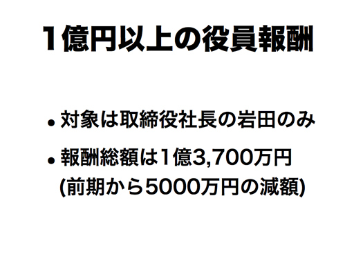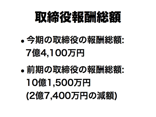 また、昨年、「1億円以上もらっている取締役はいるのか」というご質問がございました。昨年は代表取締役の6名が対象になりましたが、今期に関しましては、役員報酬が1億円以上となったのは社長の私のみでございます。先ほど、ストックオプション等のご質問もございましたが、弊社では第65期の定時株主総会終結の時をもって退職慰労金は既に廃止しております。それから、ストックオプションなどの現金以外の役員報酬もございません。従って、報酬はこれがすべてでございます。